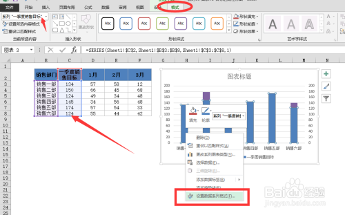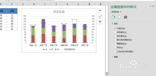 接着,更改图表的填充。选择一季度发卖方针,右键,选择数据系列格局,在系列选项下,设置间距。