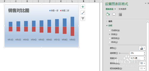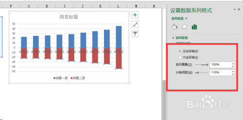 接着,选择下面的数据,设置数据系列选项,系列重叠为100%。调整分类间距,让间距变小些。