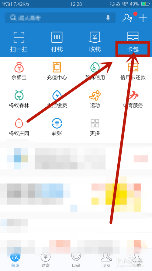 进入付出宝客户端首页后,在点击进入卡包,如图所示