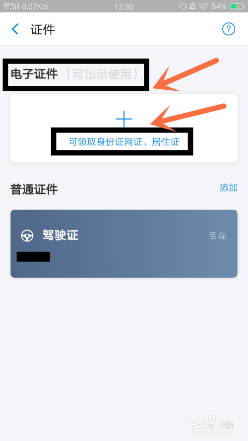 在卡包功能中,再点击打开进入证件(页面底端),如图所示