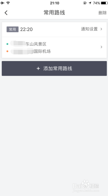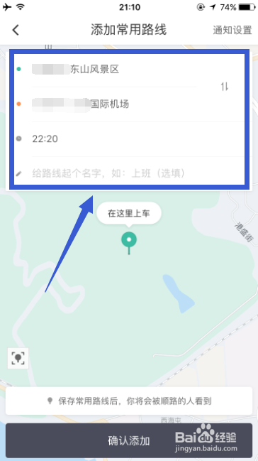 点击“添加常用路线”,在新页面中填好本身的上下班始发地、终到地以及出发时候。然后点击画面下方的“确认添加”