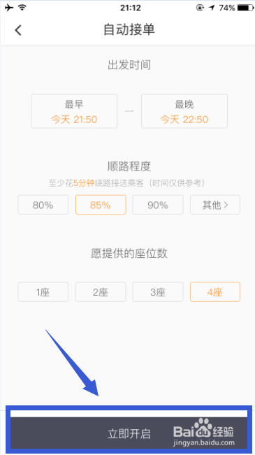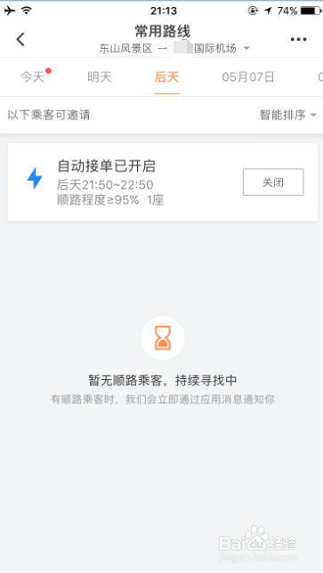 在这里我们可以选择出发时候,顺旅程度以及可供给座位数,然后点击“当即开启”,系统就会主动帮我们筛选,接单后会以短信和德律风的体例通知我们已当作功接单,我们只需要联系乘客期待出行就好了~~