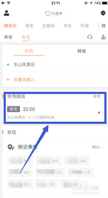 回到本家儿界面我们就能看到常用路线中呈现了我们新添加的路线,点击路线,我们会进入到顺路乘客的界面,每个乘客的顺旅程度都以百分比的形式呈现,在这里我们点击页面上方开启主动接单后的“当即设置”