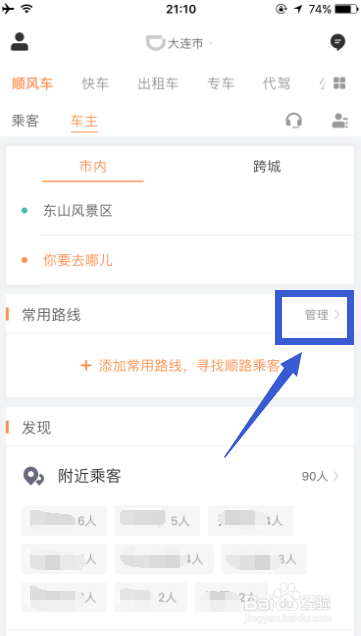 点开滴滴软件,选择“顺风车”的界面,到“车本家儿”的页面上,点击“常用路线”里的“办理”键(如图所示)