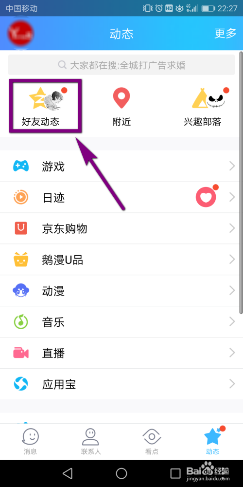 进入到图示页面今后,在页面左上方点击【老友动态】选项,如图图示。