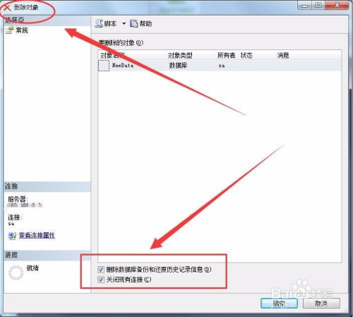 删除对象窗口中,选择删除数据库备份和还原汗青记实信息选项,同时选择封闭现有毗连选项,单击确定。