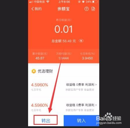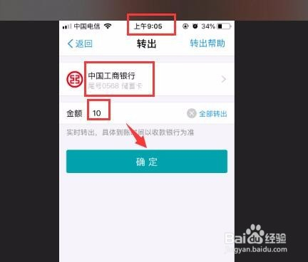 如许我们的提现金额就进入了余利宝账户了。然后点击余利宝资金页面中的转出功能,选择转出的银行卡和金额,点击确定转出就可以了。这里转出时候是9点5分。