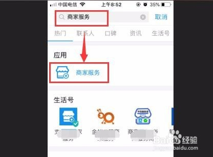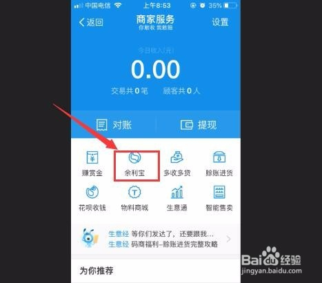 点击搜刮到的商家办事应用进入,然后在商家办事页面点击上面的余利宝进入。