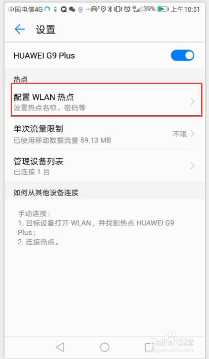第七,还可以设置热点的名称和密码,如图所示,点击这个选项,可以在里面设置密码什么的。如许就OK了,你学会了吗