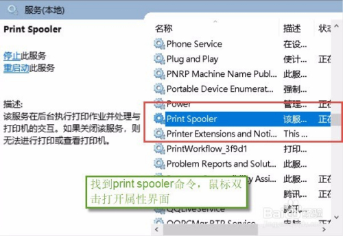 操作四:再办事界面上右上方窗口,找到【print spooler】选项,而且用鼠标左键双击打开属性对话框,操作图片步调如下。