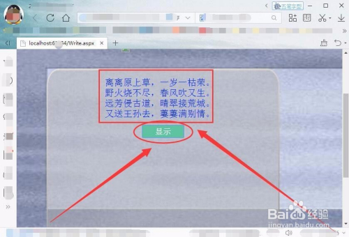 在浏览器中浏览网页,单击网页中的显示按钮后,本身设置的诗句内容就在页面中显示出来。