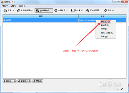 点击钱包上的接管瑞郎币,鼠标单击右键复制地址,发送给对方。