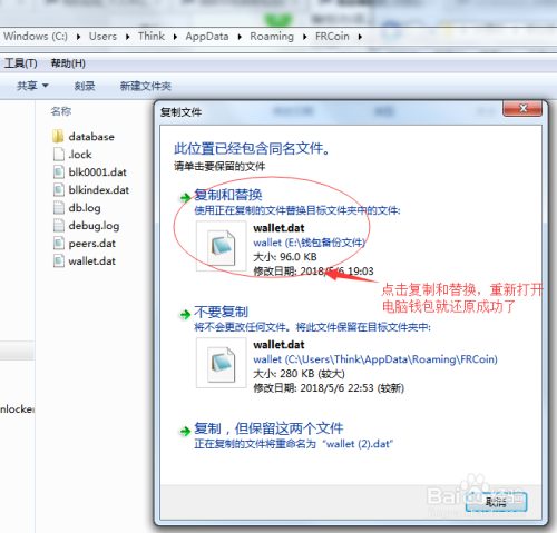 还原:改换新电脑后,点击打开计较机 在地址栏输入 %appdata%/frcoin 把本来备份文件名(瑞郎币钱包备份文件)称改当作wallet,然后复制到 %appdata%/frcoin 目次下 笼盖替代,点击复制和替代,从头打开电脑钱包就还原当作功了。