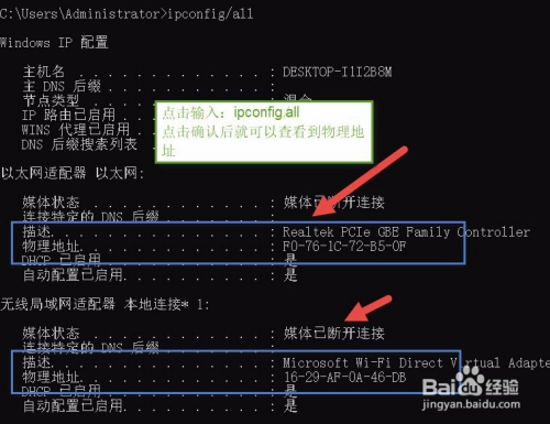 操作二:在办理员界面上输入ipconfig/all,点击确认,就可以看到网卡的物理地址,操作图片步调如下。