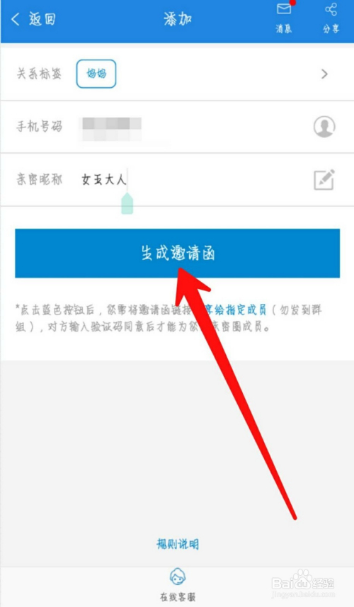 在这个【添加】页面,选择【关系标签】,输入【手机号】,填写【亲密昵称】,然后点击一下【生当作邀请函】。