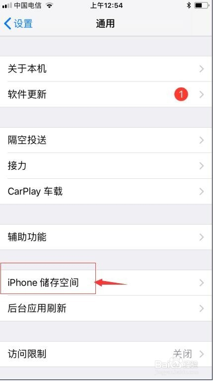 在通用页面找到iPhone储存空间;