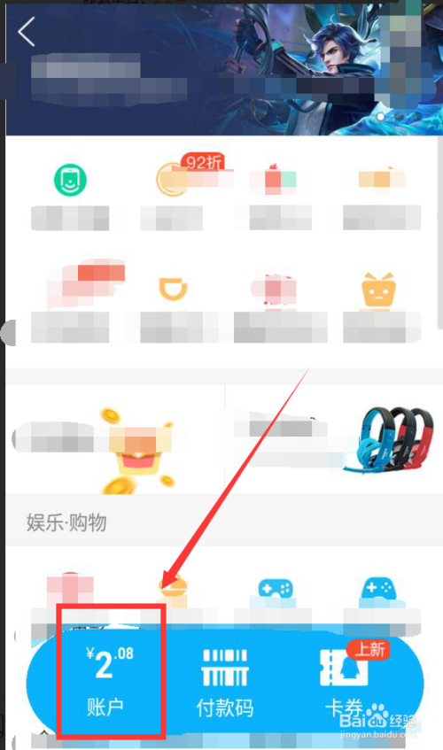 打开钱包选项,可进入外卖、购物功能,还有其他办事,最下方会显示账户余额,此为现金数额,并不是Q币,点击此处打开。