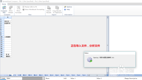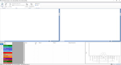打开文件后,软件界面分五部门显示,上面两部门,左侧显示旧文件,右侧显示新文件。菜单栏有调节显示体例的按钮:show formuias——显示公式、resize cells to fit——单位格宽度适合内容显示、show workbook formatting——以原有文件格局显示;