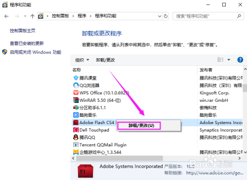 在“法式和功能”里找到Adobe Flash Cs4,右击选择“卸载/更改”,如图所示