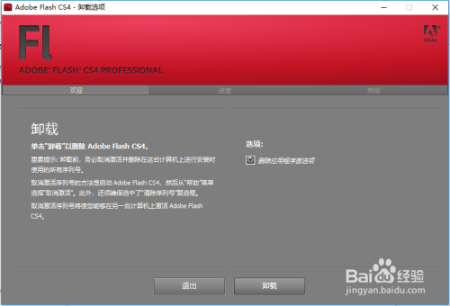 来到Adobe Flash Cs4-卸载选项窗口,,你可以勾选“删除程法式首选项”点击“卸载”,如图所示