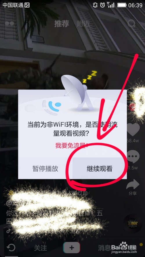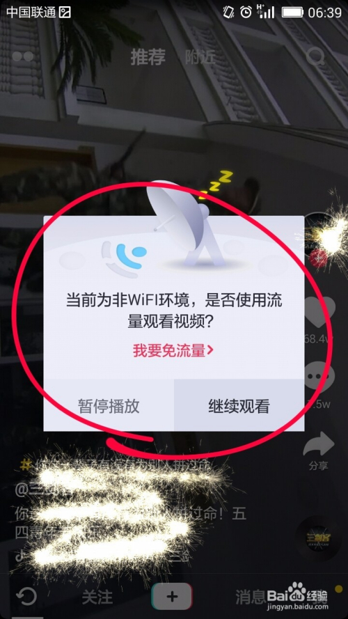 这时,在打开的抖音页面中可能会碰到非WiFi情况是否利用流量不雅看的提醒;