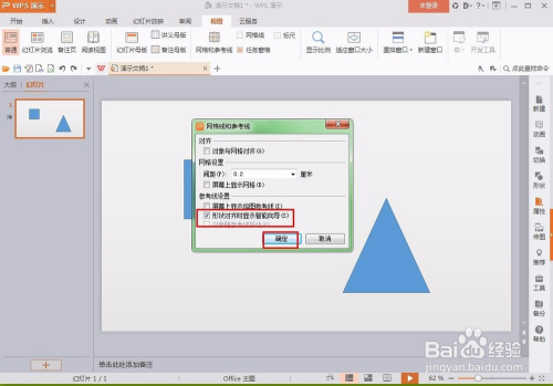 接着弹出网格线和参考线的设置窗口,在参考线设置选项一栏,将外形对齐时辰的阿谁选项前面打上勾,然后点击确定