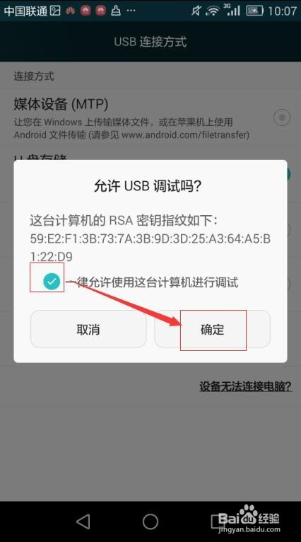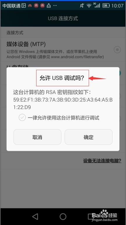 在本身的手机上呈现许可USB调试吗的扣问框;