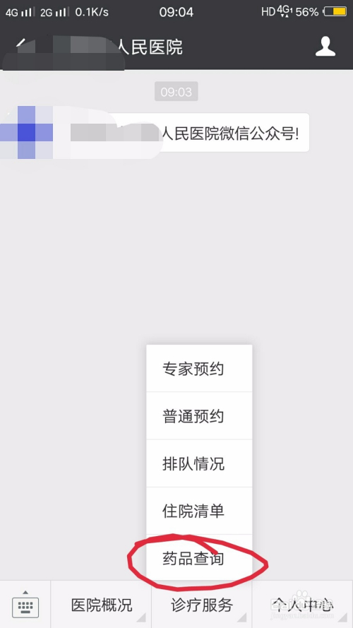 我们进入对话页面后找到底下的诊疗办事,然后在点击最后的药品查询,可能每个病院的页面设置都分歧。