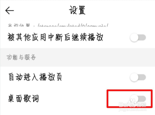 进入到设置界面,下拉页面找到【桌面歌词】并点击打开,打开之后是绿色的功能条。