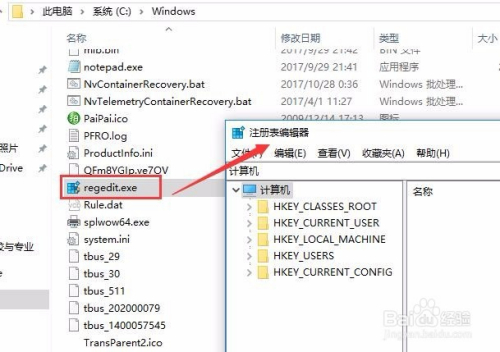 那么我先讲下怎么找到注册表文件,如上图在电脑系统盘的window文件夹里面,很轻易就可以看到regedit.exe这个法式,双击就可以直接进入注册表了。