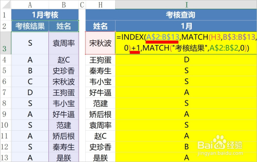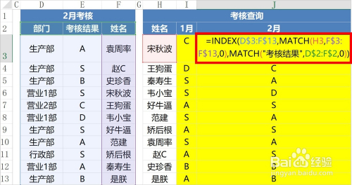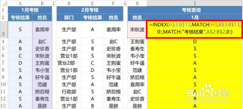 我们要在最右边的表查询员工1月、2月的查核成果。