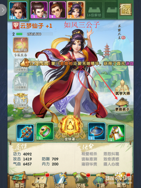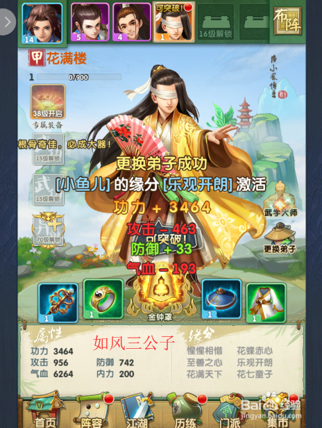 当作功替代门生后,此时游戏页面会显示当前脚色上升或者下降的属性值。