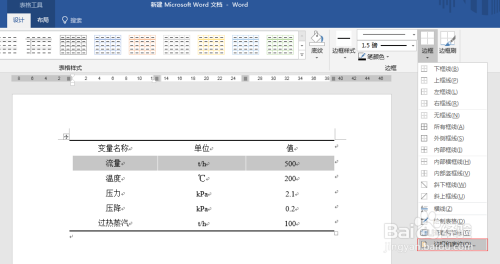 接下来,我们要把表格中的线全数去失落。方式是选中整个表,在菜单栏中选择设计-边框,在边框下拉菜单中选择无边框