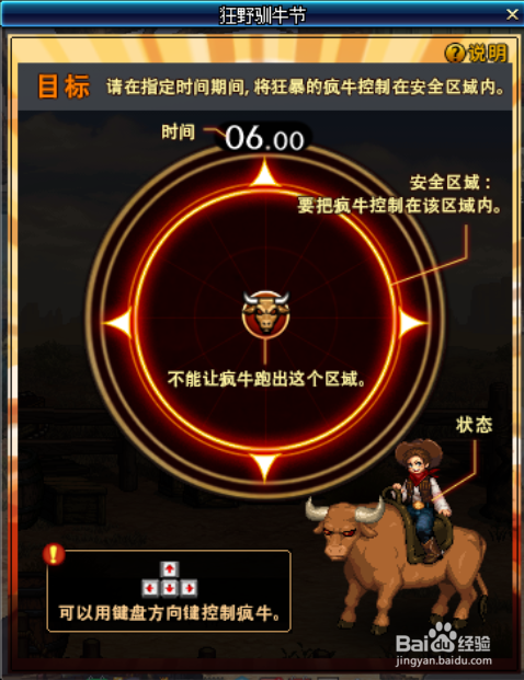 在弹出的【狂野驯牛节】的面板右上方,点击申明按钮,可以查看游戏的弄法,然后点击【游戏起头】按钮进入游戏。