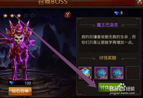 我们再次点击呼唤出来的BOSS,进入BOSS的伐罪页面。我们可以设置装备摆设挑战BOSS精灵的,设置装备摆设。