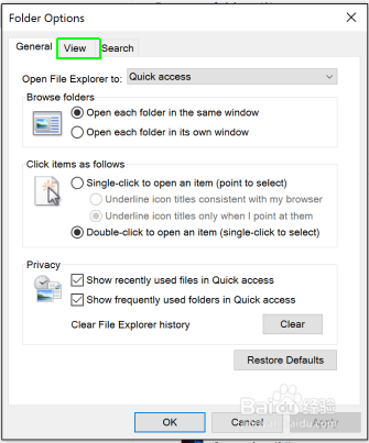 单击选项。 文件夹选项窗口将呈现。