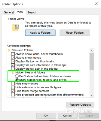 选择“显示埋没的文件,文件夹和驱动器”,然后单击应用。