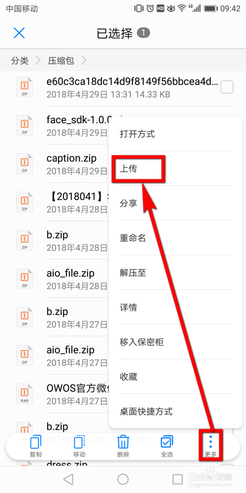 选中文件后,点击页面右下位置的竖直的三个点符号,然后在弹出的菜单中点击选择【上传】选项。