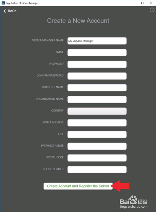 要建立新帐号,请填写以下信息,然后单击“Create Account and Register the Server”