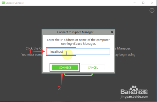 在vSpace Server和vSpace Manager之间成立毗连:“localhost”已经预填充在文本框中;单击 “CONNECT“