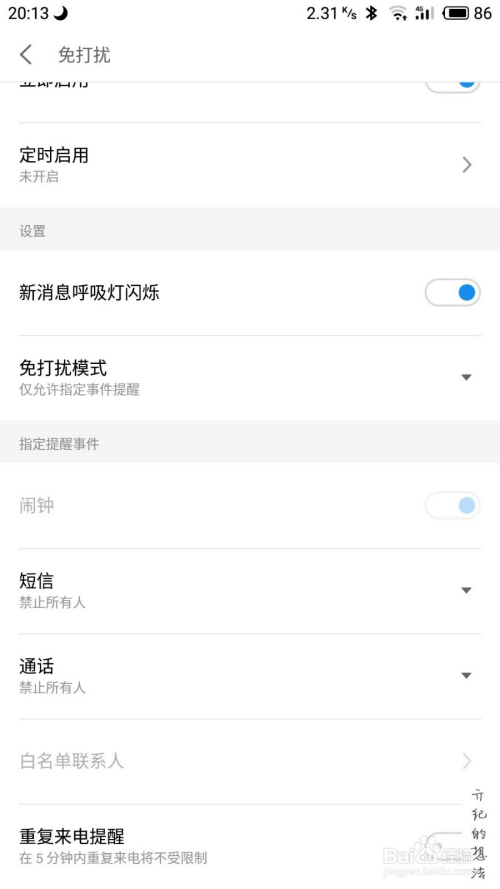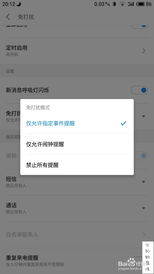 点击免打搅模式菜单,可以自界说可以提醒的事项。仅许可闹钟提醒时是如许的界面。