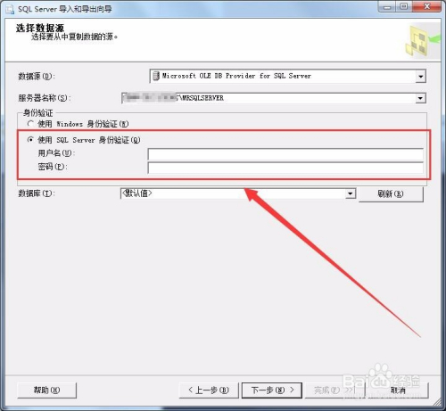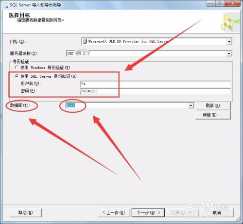 选择利用SQL Server身份验证,输入用户名和密码,数据库中选择复制到的方针数据库,本例为fish数据库。