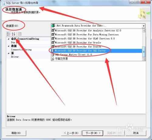 选择数据源窗口中,单击数据源后的下拉框,选择Microsoft OLE DB Provider for SQL Server选项。