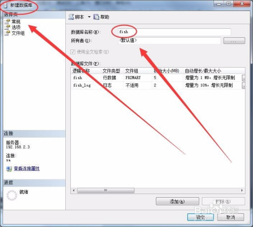 在新建数据库窗口中,输入数据库名称,本例为fish。