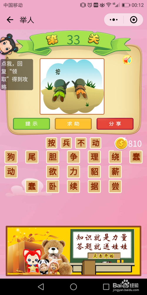 举人第35关,直接经由过程画面得出关头字——依、顺,加上图上的×100,就想到了100个依和100个靠字,简称【视为心腹】。