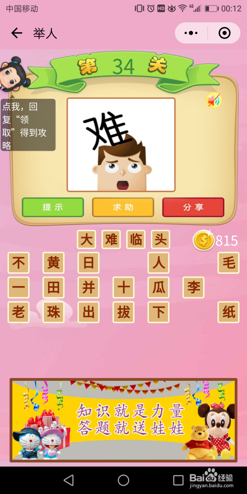 举人第34关,头上有一个难字,并且这个难字很年夜,首先会想到浩劫当头,可是下面的文字傍边并不克不及凑出这四个字,所以我们找到同义词【浩劫临头】。