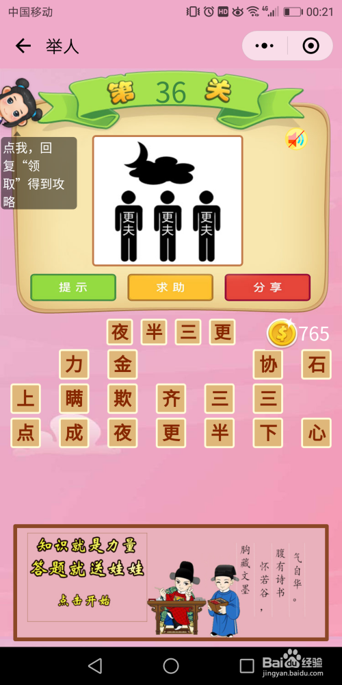 举人第36关,画面中的月亮申明时候是晚上,单个更夫则申明具体时候是三更,三更就是晚上的12点,我们习惯大将12点摆布当作为三更。所以想到当作语【三更三更】。