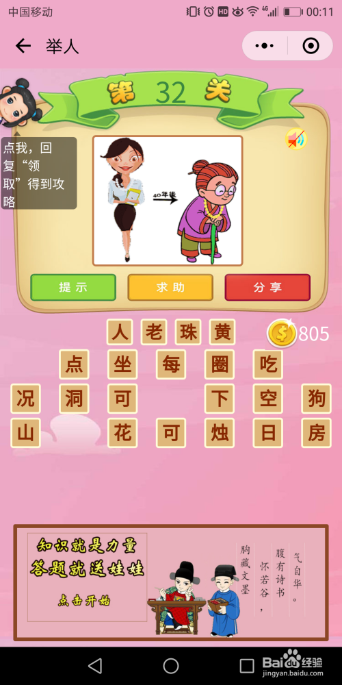 举人第32关,画面上一个美男40年后酿成了老妇人,老妇人就【老树枯柴】了。