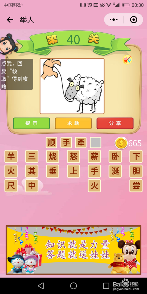 举人第40关,一只手牵着一只羊,直接想到谜底【随手牵羊】。