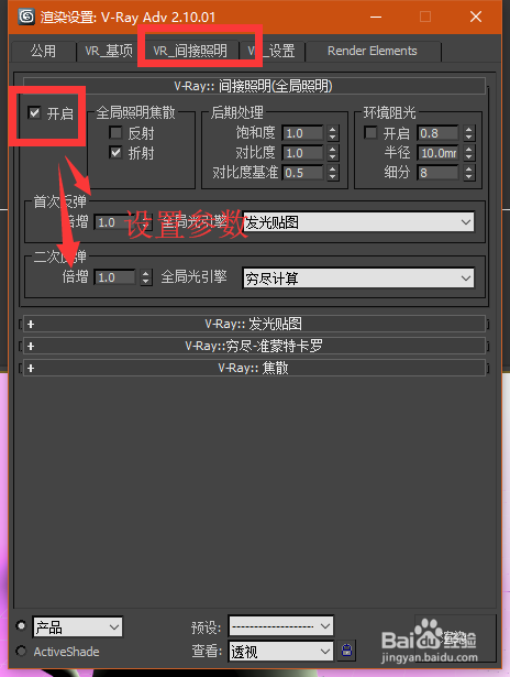 8. 调整VR_间接照明。快捷键F10,在衬着设置窗口下选择【VR_间接照明】->开启间接照明->设置初次反弹 和二次反弹的参数如下图所示。